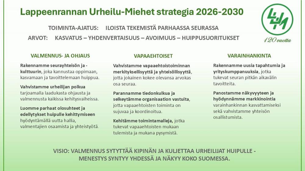 LUM on perinteikäs kasvattajaseura ja vahva kisajärjestäjä. Seuran motto on tarjota ”urheilua ja liikuntaa vauvasta vaariin”. Tästä hyvänä osoituksena on seuran jäsenistön ikähaitari 3-90-vuotta. LUM tarjoaa monipuolisia yleisurheilukokemuksia niin nuoriso- kilpa- kuin kuntourheilussakin. Tämän lisäksi seura järjestää monia maakunnallisestkini merkittäviä tapahtumia taloutensa ylläpitämiseksi, kuten Iitiän lavan tanssitoiminta, Muikku ja Pottu kalamarkkinat, yleisurheilun Motonet GP kilpailun, ym.